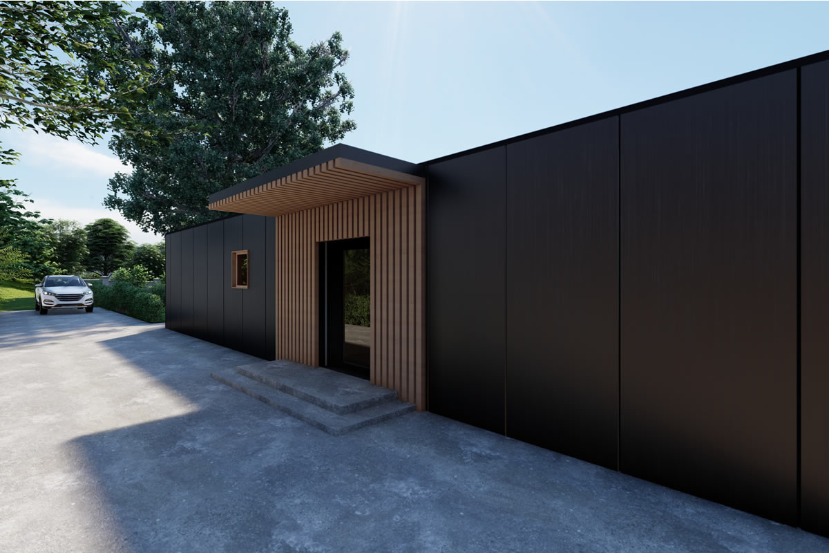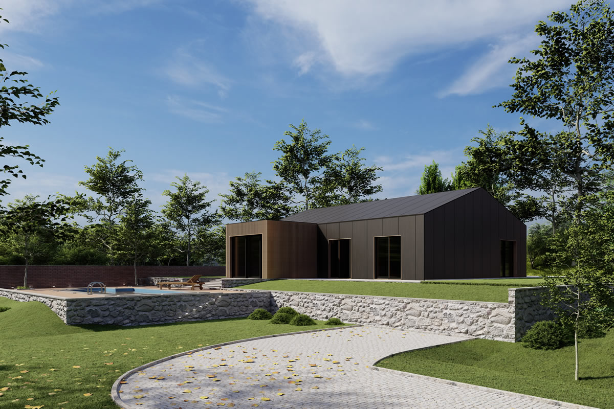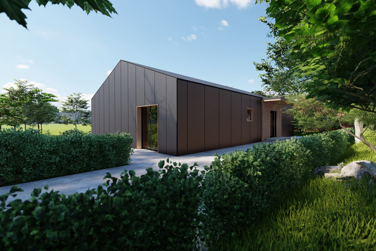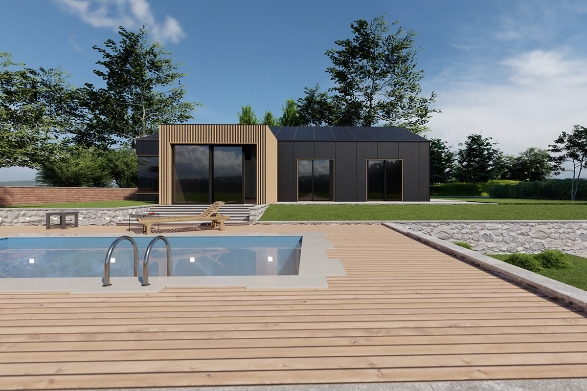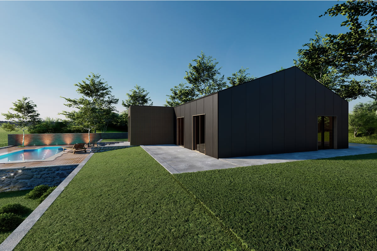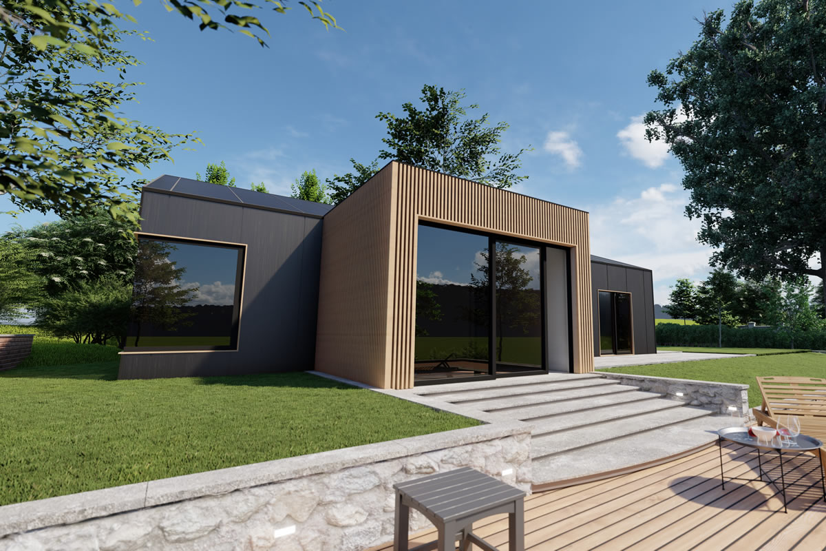 Große Fenster lassen viel Licht in den Innenraum, der großzügige Wohn- und Essbereich erhält eine markante Eckverglasung und bietet direkten Zugang in den eigenen Garten. An den Wohnbereich schließt die geräumige Küche an, die zum gemeinsamen Kochen mit Freunden und Verwandten einlädt.