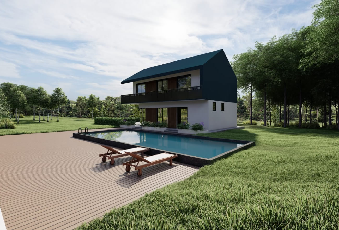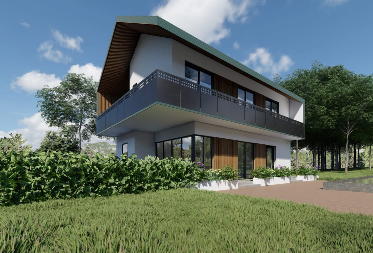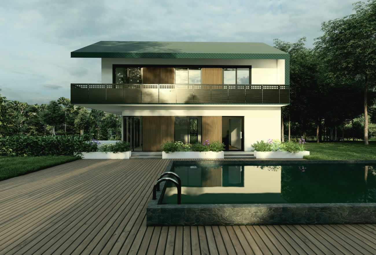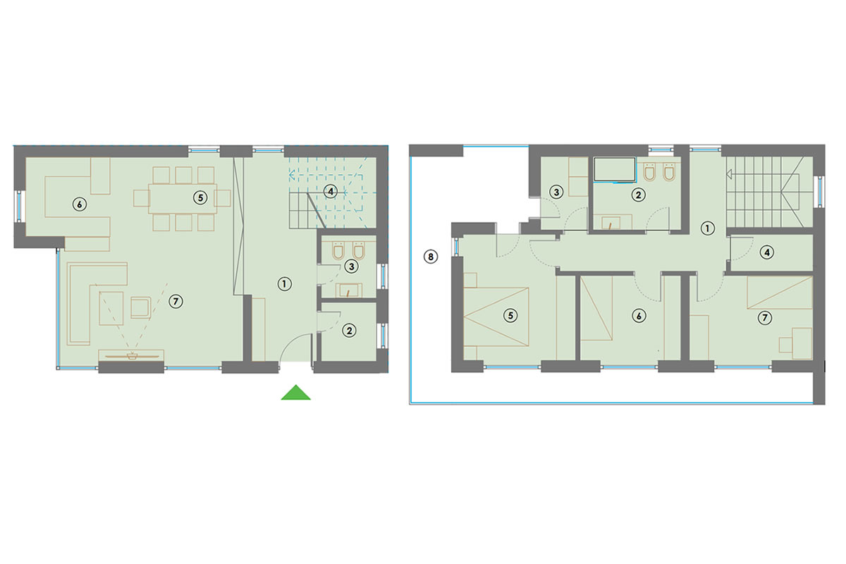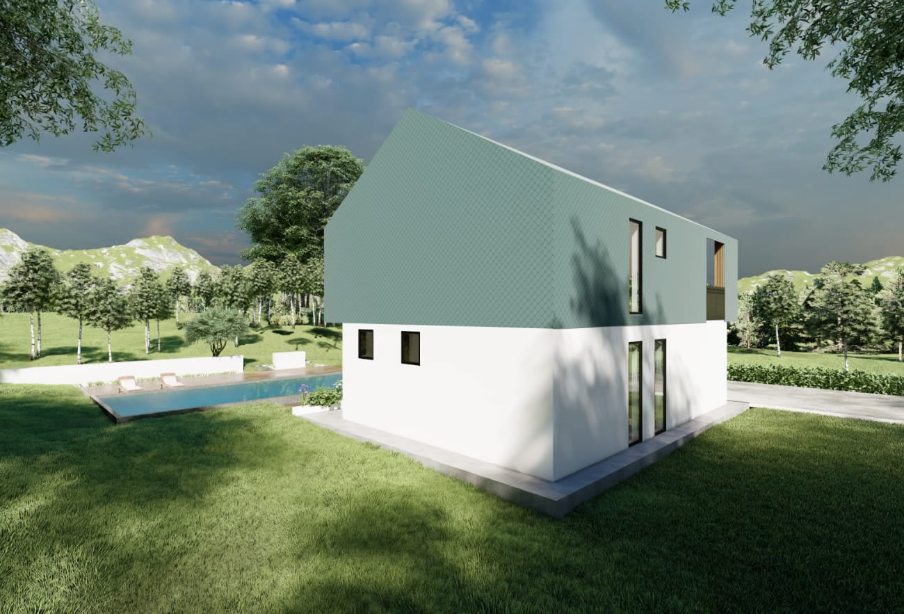 Das Haus bietet mit mehr als 220 qm pures Wohnvergnügen für die ganze Familie. Der fast umläufige Balkon im Dachgeschoss taucht die Räume jederzeit ins rechte Licht und bietet Rückzugsmöglichkeiten in der Natur. Zusätzlich wird so unterhalb des Balkons ein Carport fürs Auto geschaffen – wenn das nicht durchdacht ist. Die Treppe ist so platziert, dass sie im Erd- und Dachgeschoss nur sehr wenig Raum einnimmt, der dadurch Platz für Diele oder großzügigen Flur schafft. Das zusätzliche Zimmer im Erdgeschoss bietet die Möglichkeit ein Arbeits- oder Gästezimmer einzurichten, ganz wie es euch beliebt.