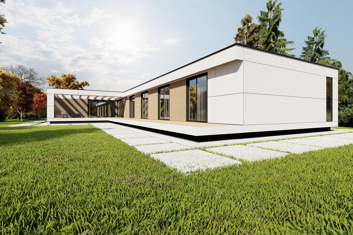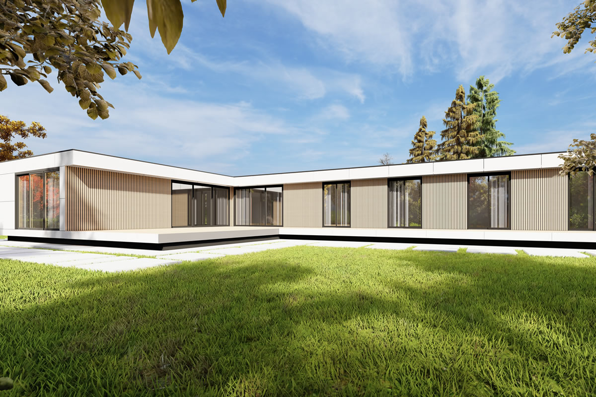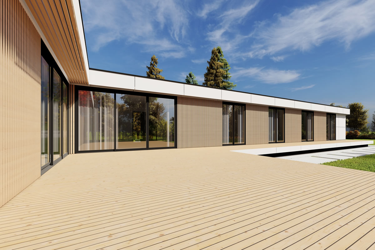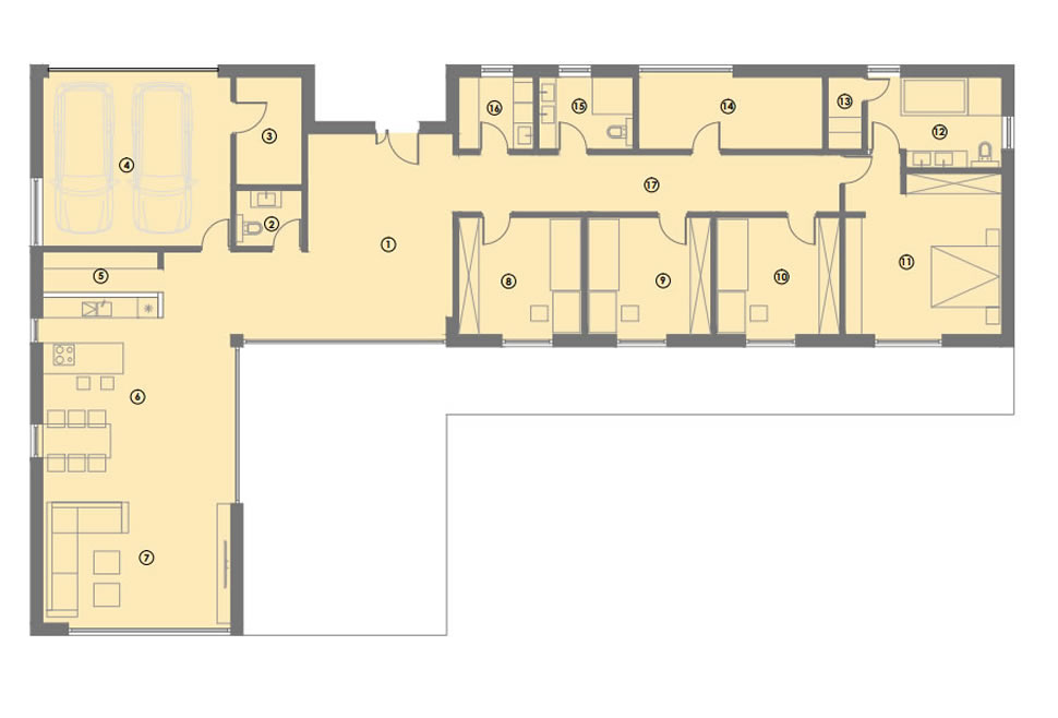 Dass ein Winkelhaus immer ein bisschen schöner und faszinierender wirkt, liegt wohl an der großzügig geschnittenen Sonnenterrasse, welche durch den intelligenten Winkelbau nicht nur vor Wind und Wetter schützt, sondern gleichzeitig auch den Blick auf die Landschaft öffnet. Wohn- und Essbereich bilden den Mittelpunkt, des durch große Fenster und kleine Details bestechenden Familienhauses. Der Zugang zur Terrasse lädt zum Entspannen im Garten ein, sodass dieser Grundriss keine Wünsche offen lässt.